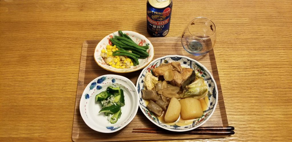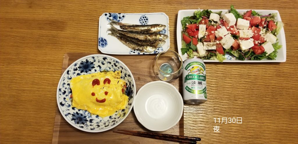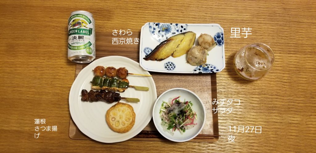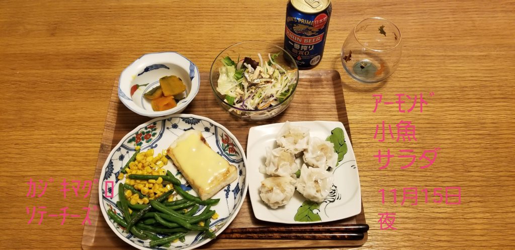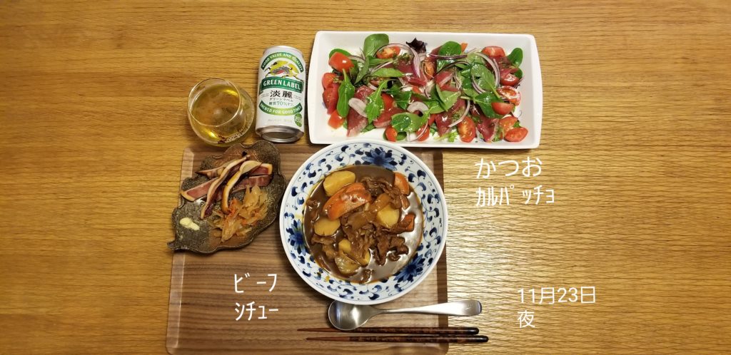 夕食、なかなか豪華、糖質OFFのためご飯は食べません。